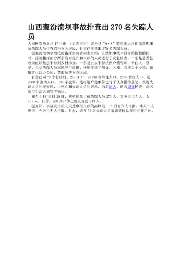 山西襄汾潰壩事故排查出270名失蹤人員