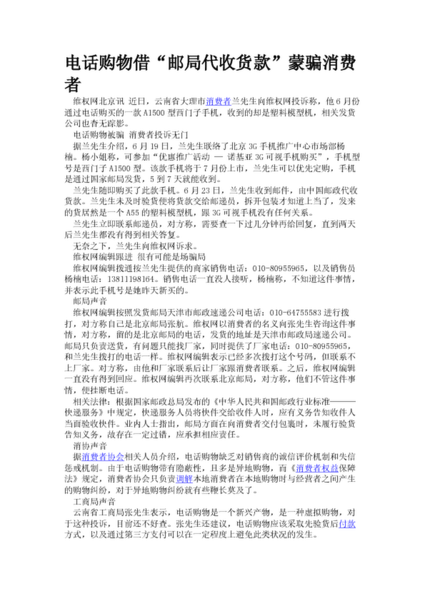 電話購物借“郵局代收貨款”蒙騙消費者(25.76KB)