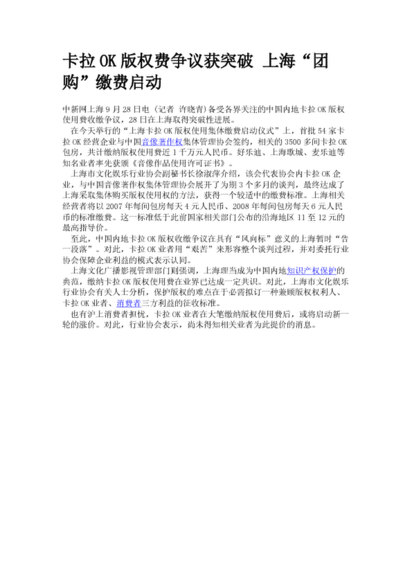 卡拉OK版權費爭議獲突破 上海“團購”繳費啟動