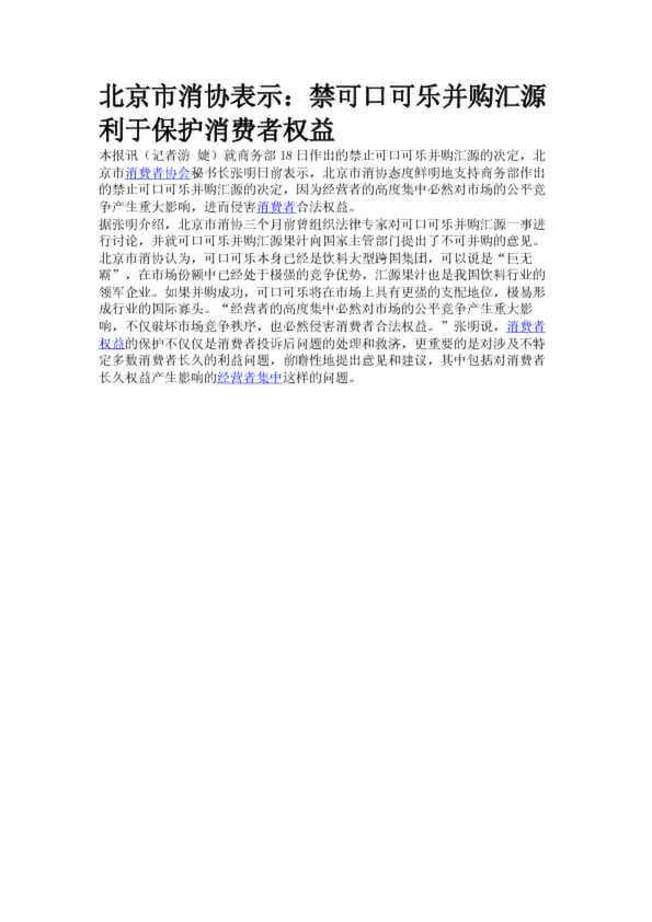 北京市消協表示:禁可口可樂并購匯源利于保護消費者權益