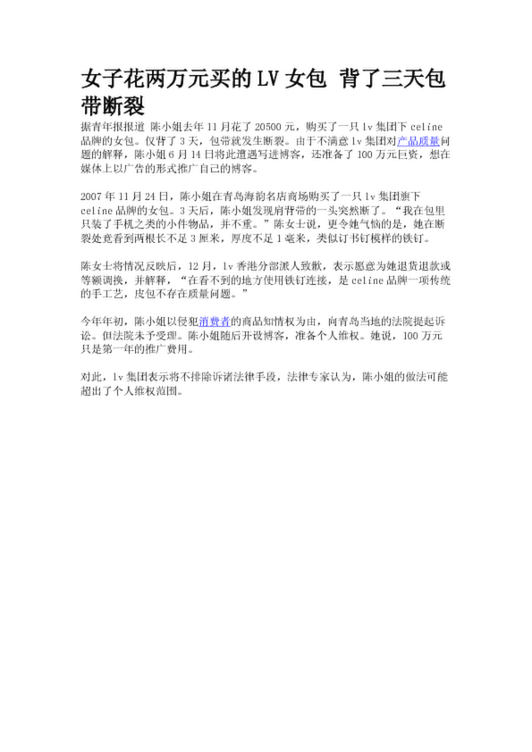 女子花兩萬元買的LV女包 背了三天包帶斷裂