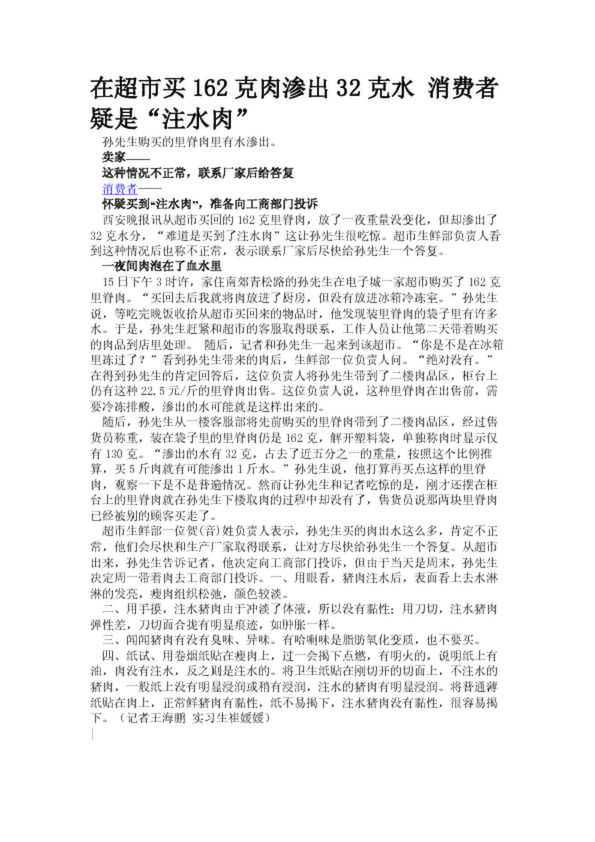 在超市買162克肉滲出32克水 消費者疑是“注水肉”