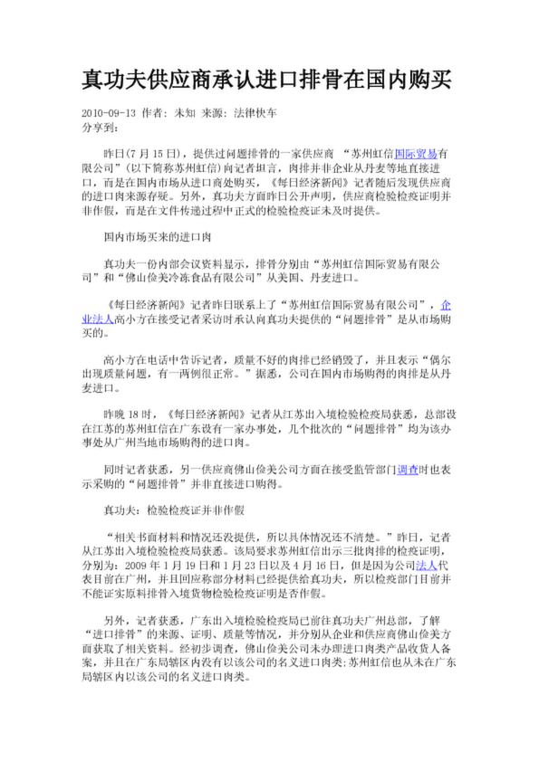 真功夫供應商承認進口排骨在國內購買