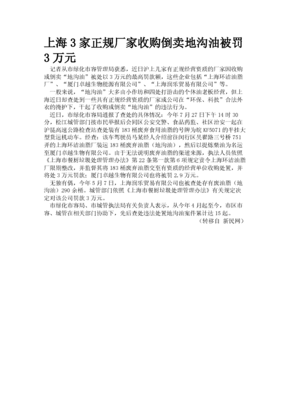 上海3家正規廠家收購倒賣地溝油被罰3萬元(17.62KB)