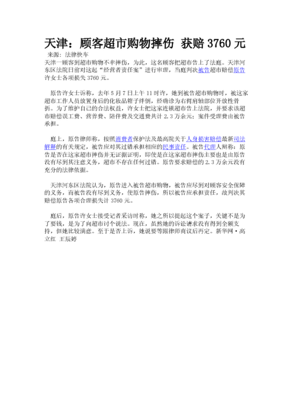 天津:顧客超市購物摔傷 獲賠3760元(19.95KB)