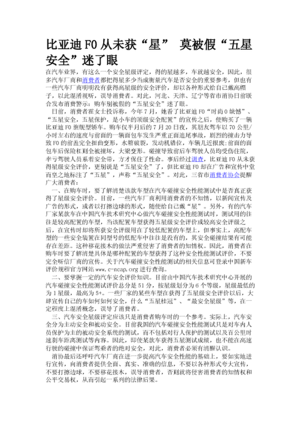 比亞迪F0從未獲“星” 莫被假“五星安全”迷了眼(20.08KB)