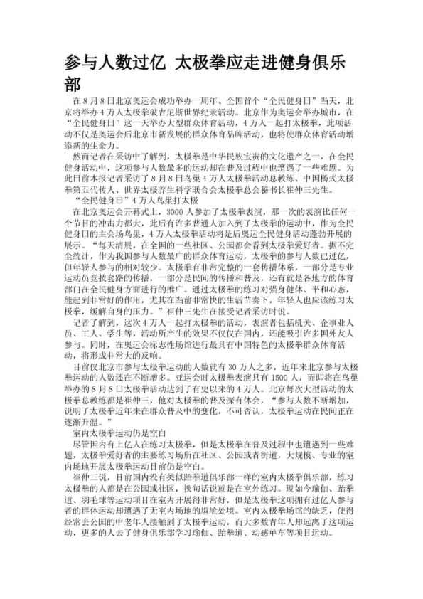 參與人數過億 太極拳應走進健身俱樂部