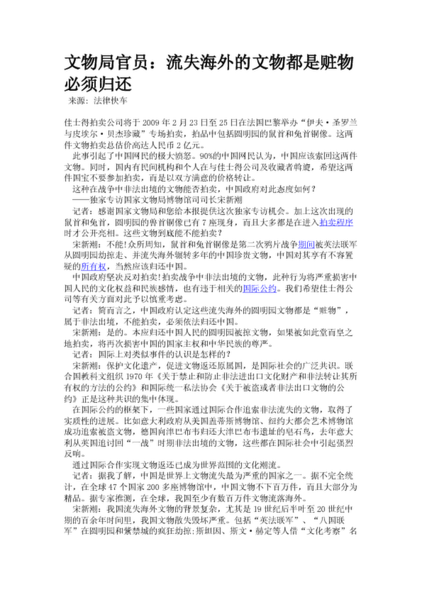文物局官員:流失海外的文物都是贓物必須歸還