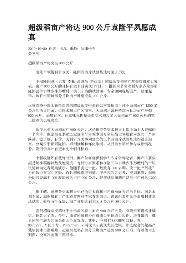 超級稻畝產將達900公斤袁隆平夙愿成真
