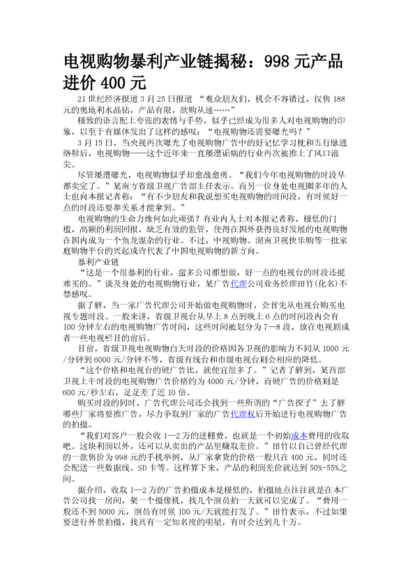 電視購物暴利產業鏈揭秘:998元產品進價400元(28.37KB)