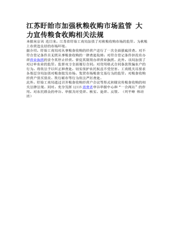 江蘇盱眙市加強秋糧收購市場監管 大力宣傳糧食收購相關法規