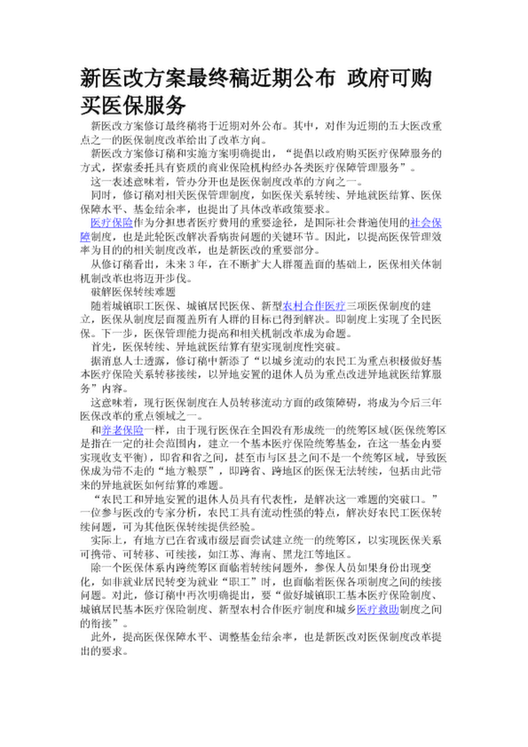 新醫改方案最終稿近期公布 政府可購買醫保服務(31.61KB)