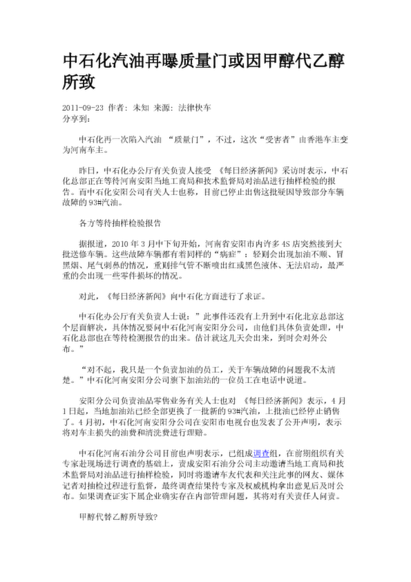 中石化汽油再曝質量門或因甲醇代乙醇所致