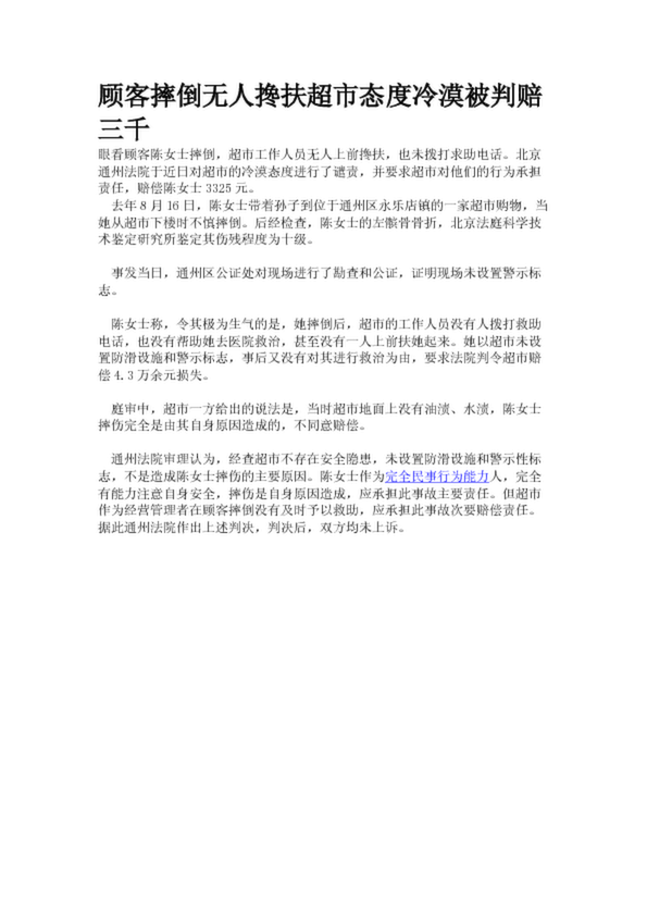 顧客摔倒無人攙扶超市態度冷漠被判賠三千(18.35KB)