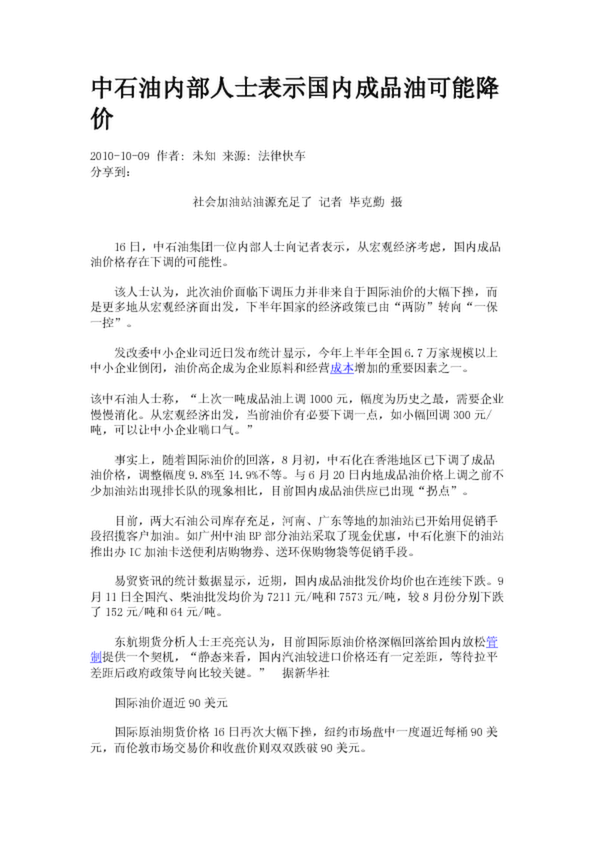 中石油內部人士表示國內成品油可能降價