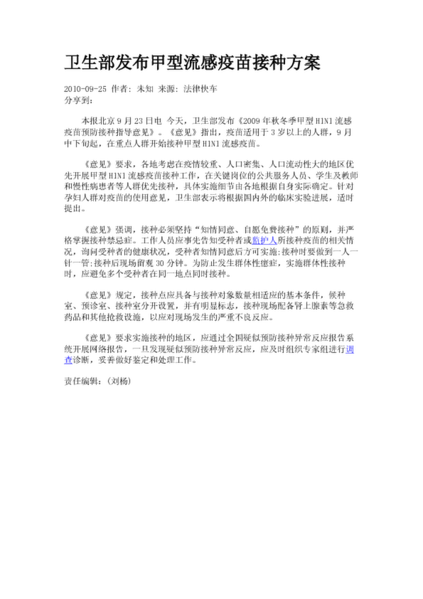 衛生部發布甲型流感疫苗接種方案(2.95KB)
