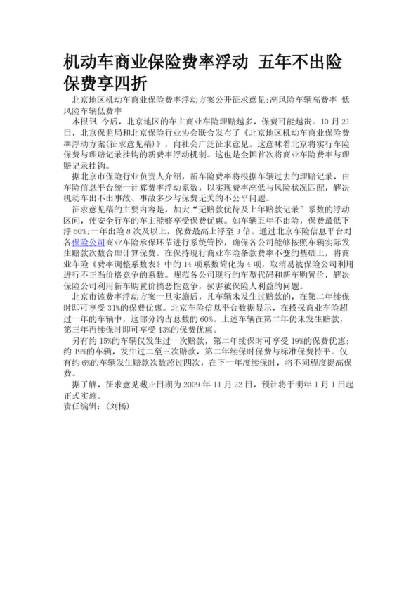 機動車商業保險費率浮動 五年不出險保費享四折(18.71KB)