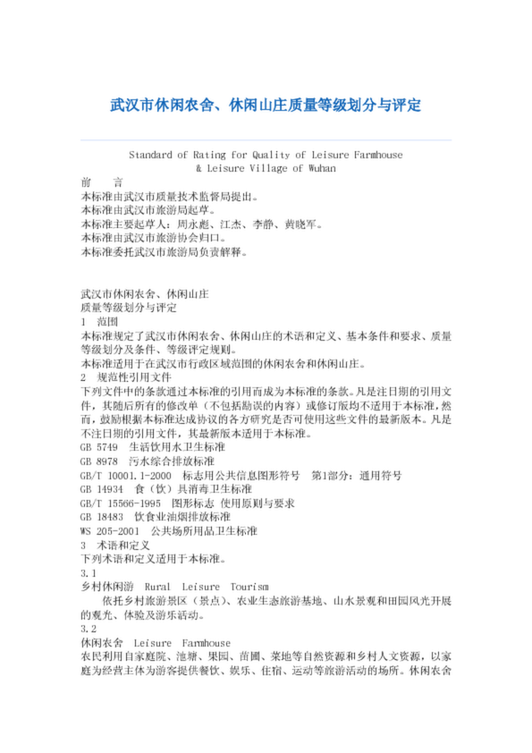 武漢市休閑農舍、休閑山莊質量等級劃分與評定