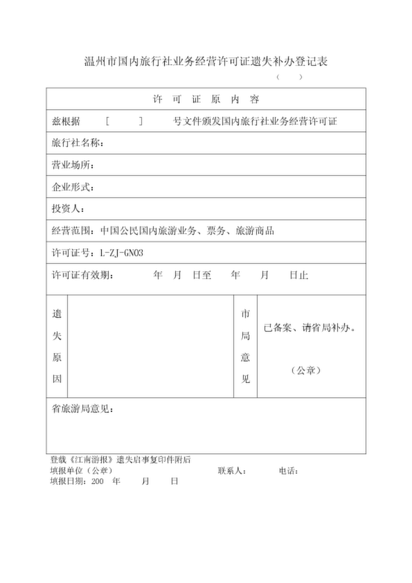 溫州市國內旅行社業務經營許可證遺失補辦登記表