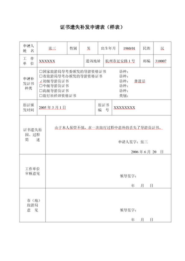 證書遺失補發申請表(樣表)