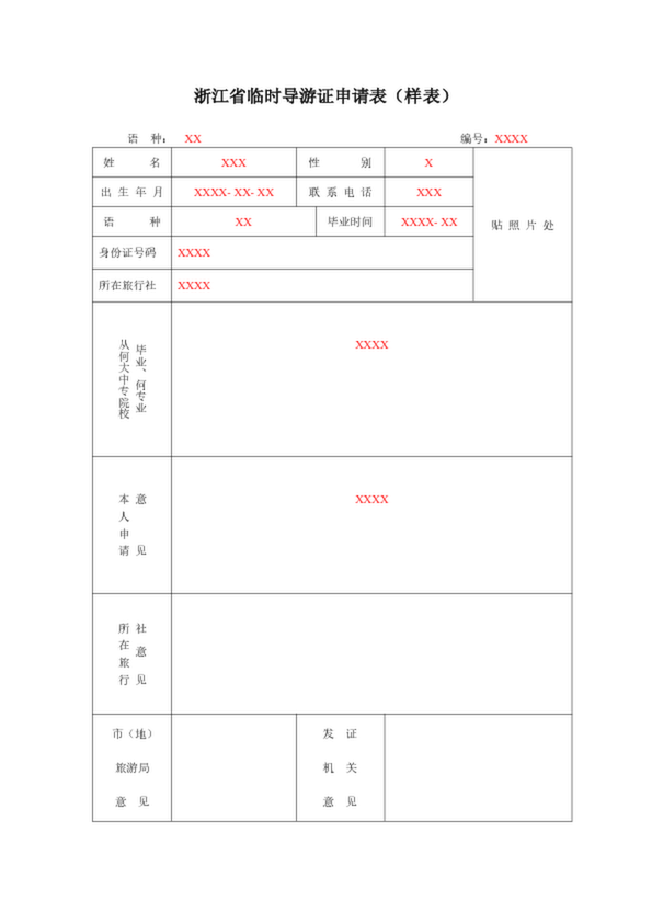 浙江省臨時導游證申請表(樣表)