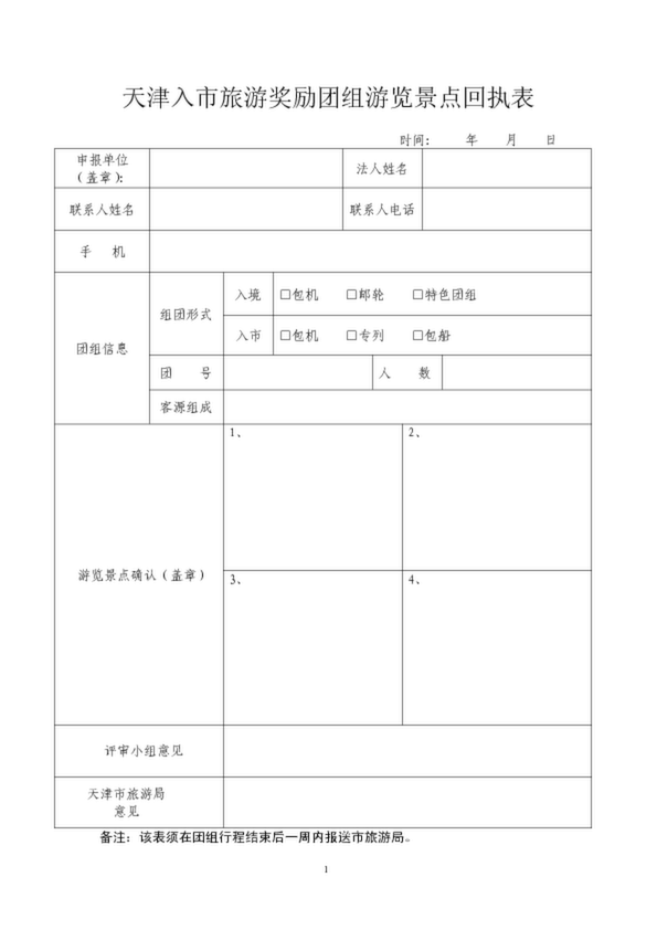 天津入市旅游獎勵團組游覽景點回執表