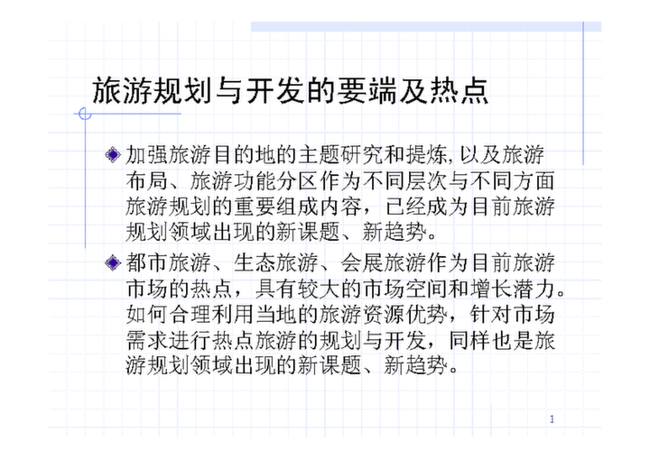 旅游規劃與開發的要端及熱點加強旅游目的地的主題研究和提煉,以及旅游 布局、旅游功能分區作為不同層次與不同方面 旅游規劃的重要組成內容,已經成為目前旅游 規劃...