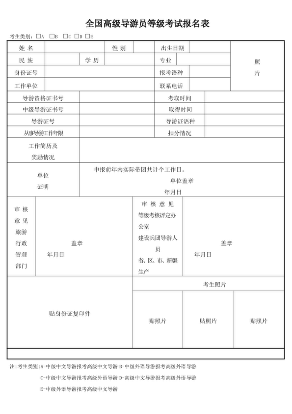 全國高級導游員等級考試報名表