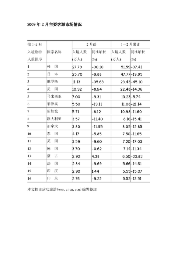 2009年2月主要客源市場情況