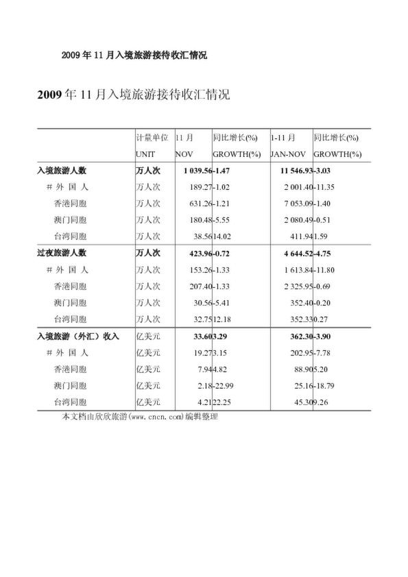 2009年11月入境旅游接待收匯情況