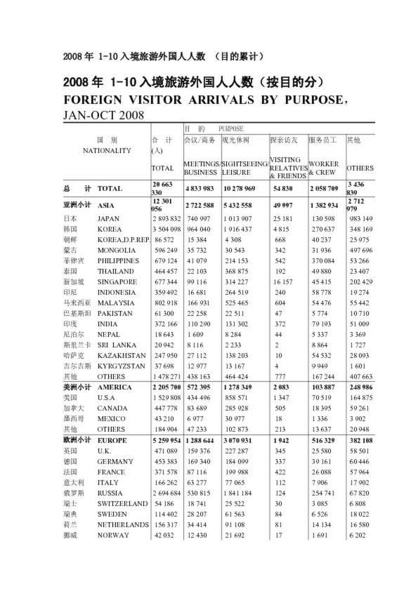 2008年 1-10入境旅游外國人人數 (目的累計)