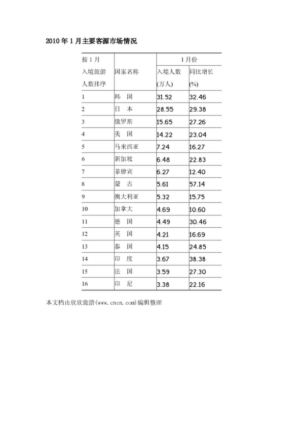 2010年1月主要客源市場情況