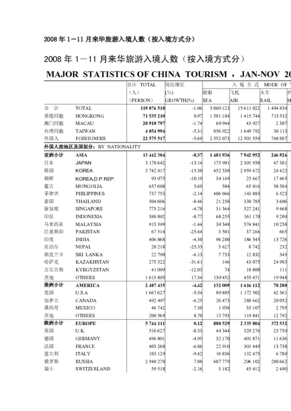 2008年1-11月來華旅游入境人數(按入境方式分)