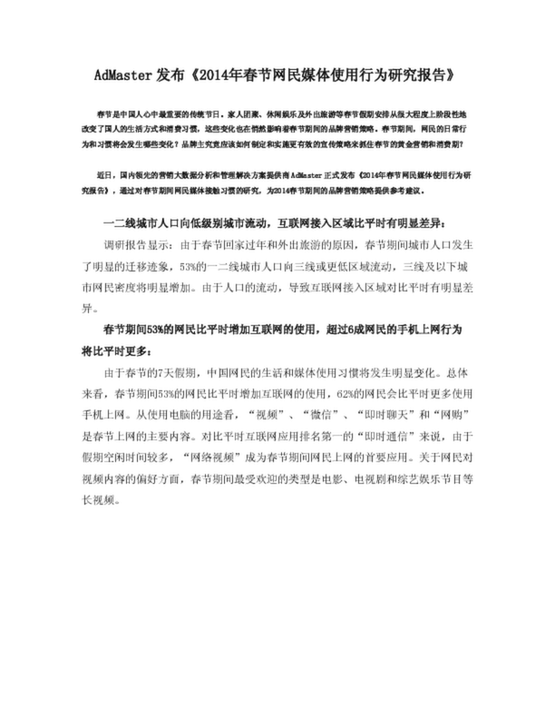 AdMaster發布《2014年春節網民媒體使用行為研究報告》(0.31MB)