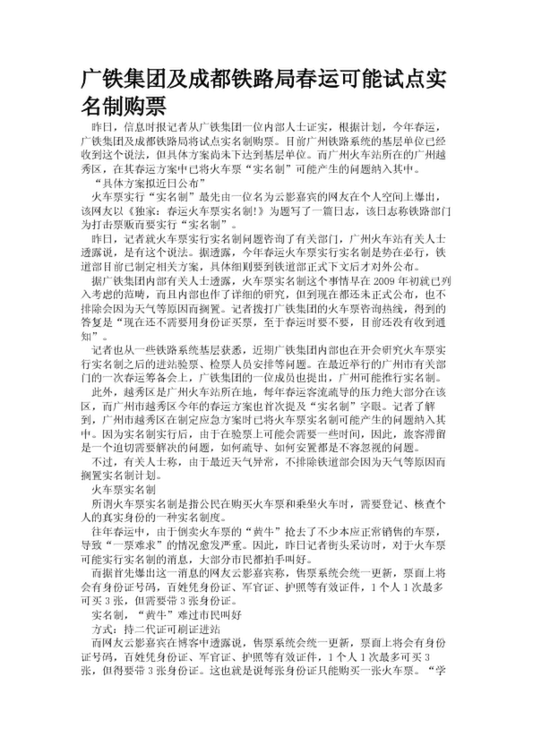 廣鐵集團及成都鐵路局春運可能試點實名制購票(33.84KB)