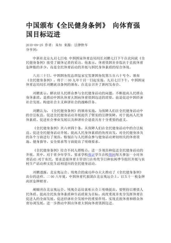 中國頒布《全民健身條例》 向體育強國目標邁進
