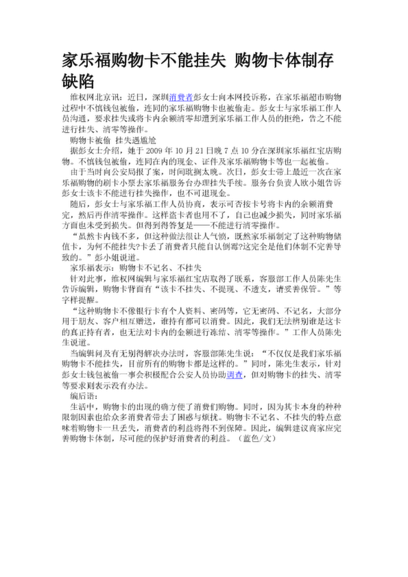 家樂福購物卡不能掛失 購物卡體制存缺陷(20.13KB)