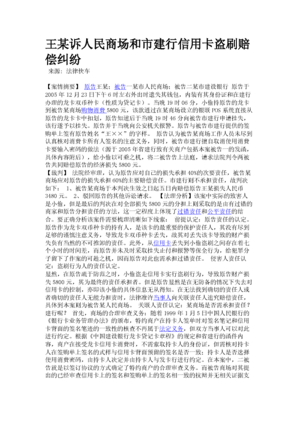 王某訴人民商場和市建行信用卡盜刷賠償糾紛