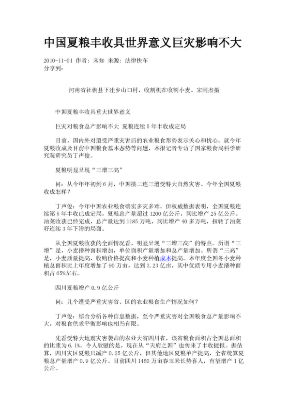 中國夏糧豐收具世界意義巨災影響不大(5.30KB)
