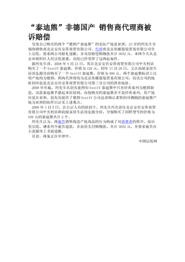 “泰迪熊”非德國產 銷售商代理商被訴賠償(18.59KB)