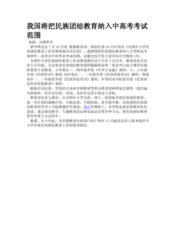 我國將把民族團結教育納入中高考考試范圍(17.71KB)